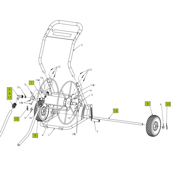 | Repère sur la vue éclatée Dévidoir 4 roues 110 mètres de tuyau d’arrosage | 10 |