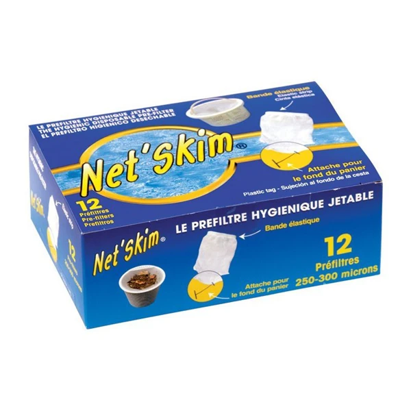- Déposer le galet de chlore au fond du panier AVANT la pose du Net’Skim et mettre l’élastique autour de la partie supérieure du panier